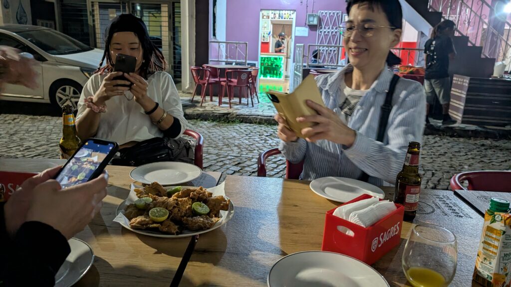 カーボベルデのTVに生出演した際に、たまたま隣の出番だった「バトゥーク」のチーム。元は大陸から連れてこられた奴隷たちが、膝を叩きながら歌い踊りしたのが起源とのこと。シンプルなフレーズが重なるポリリズムが印象的な、カーボベルデの伝統芸能の代表的なものの一つ。現代では椅子の座面のようなものを叩いて演奏されています。
